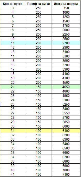 - За 21 и более (до 30 суток) доплата 150 рублей/сутки