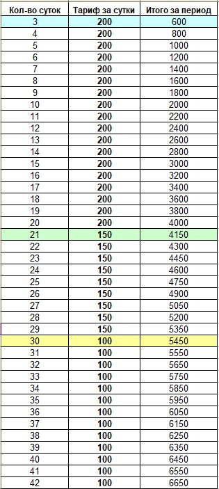 - За 21 и более (до 29 суток) доплата 150 рублей/сутки